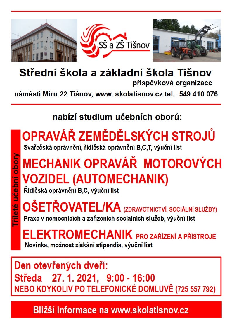 SŠ Tišnov má stále volná místa ke studiu ve všech oborech: Opravář zemědělských strojů, Mechanik opravář motorových vozidel (Automechanik), Elektromechanik pro zařízení a přístroje ( možnost stipendia), Ošetřovatel pro zdravotnictví a sociální služby. Zájemci mohou kontaktovat vedení školy nebo sekretariát: Ing. Mašek (604 242 437), Ing. Jašek (777 730 742), Mgr. Alexová (725 557 792), nebo 549 410 076.